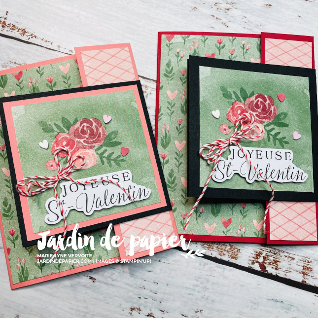 Dans la vidéo ci-dessous, je vous montre toutes les étapes pour réaliser cette carte de St-Valentin à double rabat, du pliage à la décoration finale.